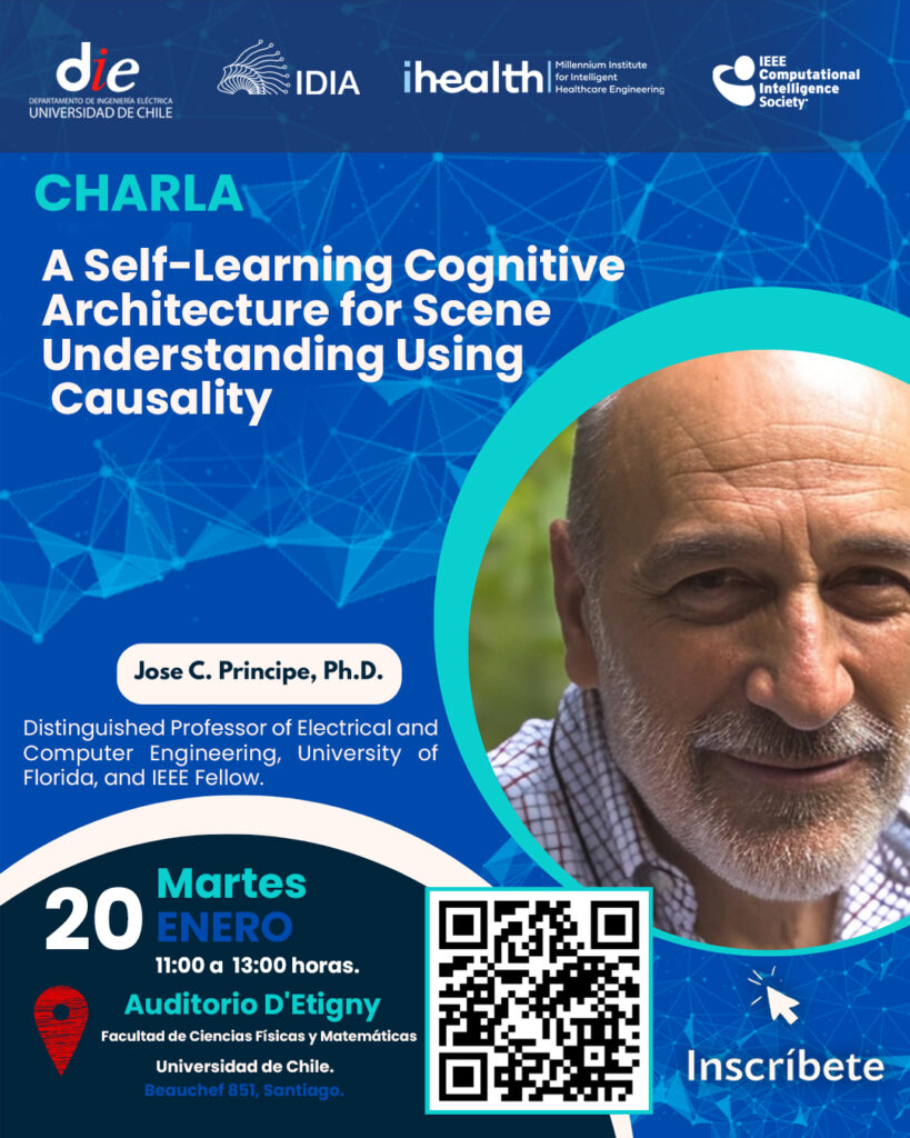 El Departamento de Ingeniería Civil Eléctrica (DIE) de la Universidad de Chile, en colaboración con la Iniciativa de Datos e Inteligencia Artificial (IDIA); el iHealth del Millennium Institute for Intelligent Healthcare Engineering y el IEEE Computational Intelligence Society, invita a la comunidad académica y pública a la charla magistral del distinguido profesor Jose C. Principe, distinguished professor of Electrical and Computer_Engineering,_University_of Florida, and IEEE Fellow.