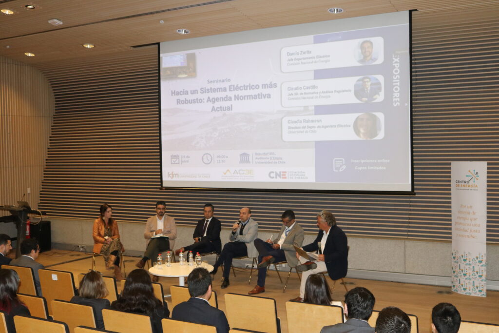 Para cerrar la jornada, se realizó un panel de discusión a cargo del profesor del Departamento de Ingeniería Civil Eléctrica, Rodrigo Palma. Panel que reunió a la directora Claudia Rahmann; al jefe del Departamento Eléctrico de la CNE, Danilo Zurita; al gerente de Operaciones del Coordinador Eléctrico Nacional, Rodrigo Espinoza; al director ejecutivo de la Asociación de Clientes Eléctricos No Regulados (Acenor), Javier Bustos; y al director de Estudios de Generadoras, Alex Santander. En la instancia, los expertos coincidieron en que la transición energética requiere avanzar decididamente en la integración de energías renovables variables, la incorporación de nuevas tecnologías, el fortalecimiento del marco regulatorio, un mercado más centrado en los clientes finales y precios de la energía competitivos y justos.